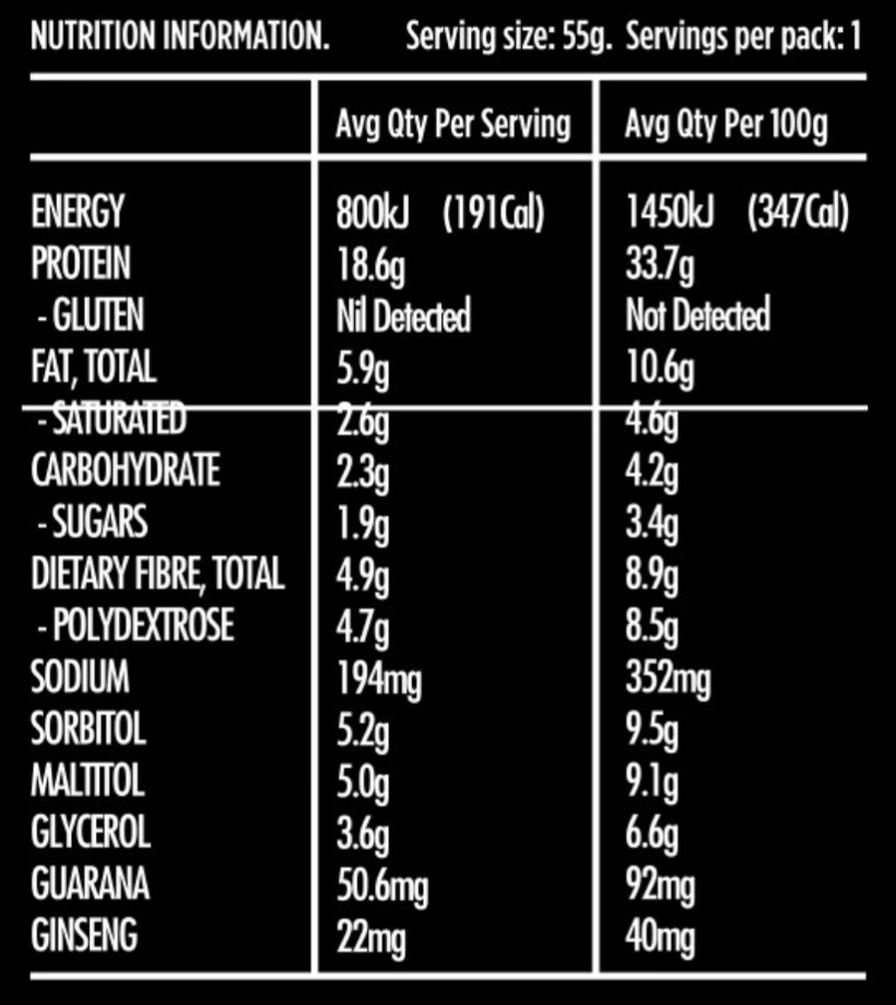 Ingredients: Protein Blend (Soy Protein Isolate, Whey Protein Isolate, Hydrolysed Collagen, Calcium Caseinate, Whey Protein Concentrate, Soy Protein Nuggets), No Added Sugar Protein Milk Chocolate 18% (Sweetener (Maltitol), Cocoa Solids 33%, Milk Solids 20%, Soy Protein Isolate, Emulsifiers (Soy Lecithin, 476), Natural Vanilla Flavour), Polydextrose, Sweetener (Sorbitol), Humectant (Glycerol), Sweetener (Maltitol), Sunflower Oil, No Added Sugar Caramel Flavoured Chips 1.8%, Cocoa Powder, Natural Flavour, Sweetener (Steviol Glycosides), Guarana, Emulsifier (Soy Lecithin), Salt, Natural Colour (Caramel I), Ginseng, Antioxidant (Mixed Tocopherols)..