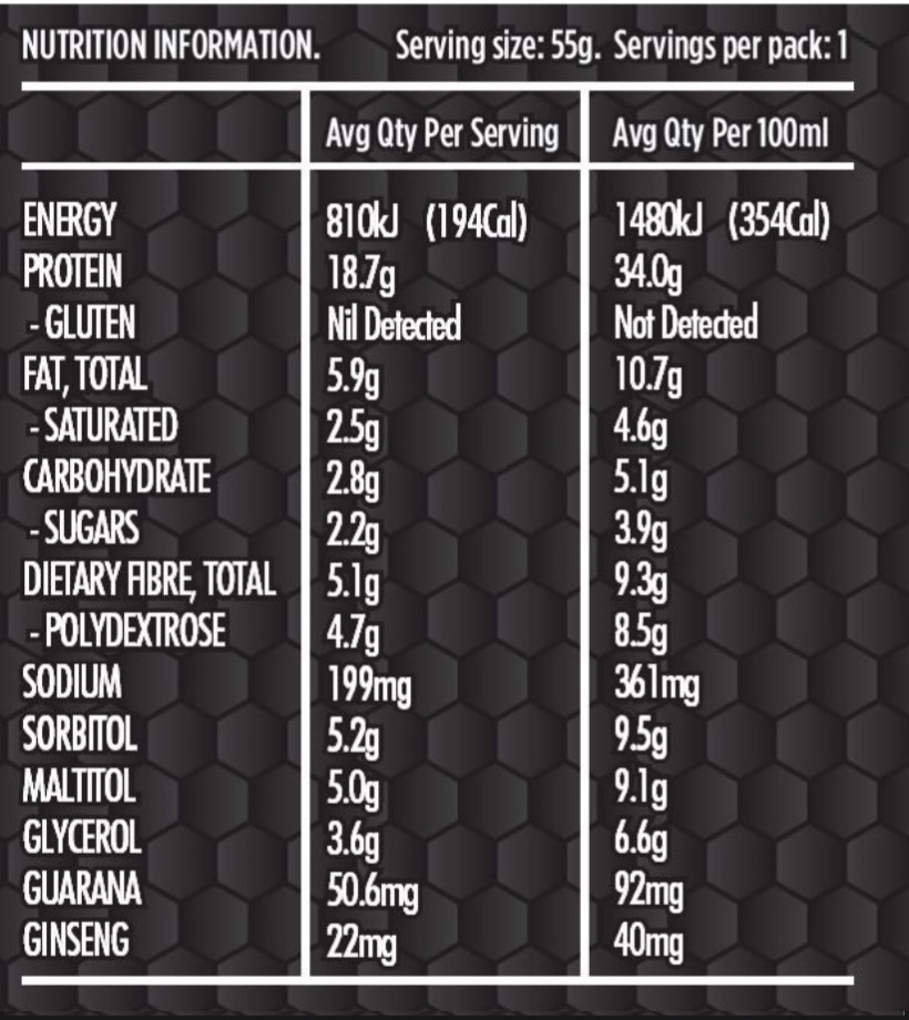 Ingredients:Protein Blend (Soy Protein Isolate, Whey Protein Isolate, Hydrolysed Collagen, Calcium Caseinate, Whey Protein Concentrate, Soy Protein Nuggets), No Added Sugar Protein Milk Chocolate 18% (Sweetener (Maltitol), Cocoa Solids 33%, Milk Solids 20%, Soy Protein Isolate, Emulsifiers (Soy Lecithin, 476), Natural Vanilla Flavour), Polydextrose, Sweetener (Sorbitol), Humectant (Glycerol), Sweetener (Maltitol), Sunflower Oil, Cocoa Powder, Raspberry Powder 1.1%, Natural Flavour, Sweetener (Steviol Glycosides), Guarana, Beetroot Powder 0.4%, Emulsifier (Soy Lecithin), Salt, Ginseng, Colour (E120), Antioxidant (Mixed Tocopherols).