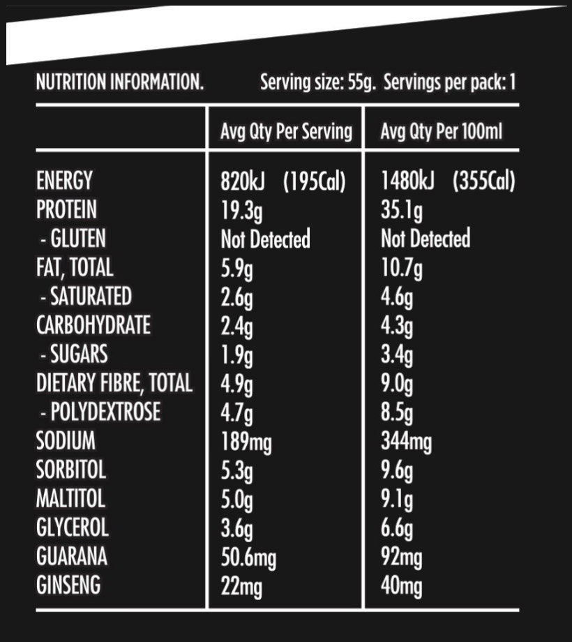 Ingredients: Protein Blend (Soy Protein Isolate, Whey Protein Isolate, Hydrolysed Collagen, Soy Protein Nuggets, Calcium Caseinate, Whey Protein Concentrate), No Added Sugar Protein Milk Chocolate 18% (Sweetener (Maltitol), Cocoa Solids 33%, Milk Solids 20%, Soy Protein Isolate, Emulsifiers (Soy Lecithin, 476), Natural Vanilla Flavour), Polydextrose, Sweetener (Sorbitol), Humectant (Glycerol), Sweetener (Maltitol), Sunflower Oil, Cocoa Powder, Natural Flavour, Sweetener (Steviol Glycosides), Guarana, Emulsifier (Soy Lecithin), Salt, Ginseng, Antioxidant (Mixed Tocopherols).